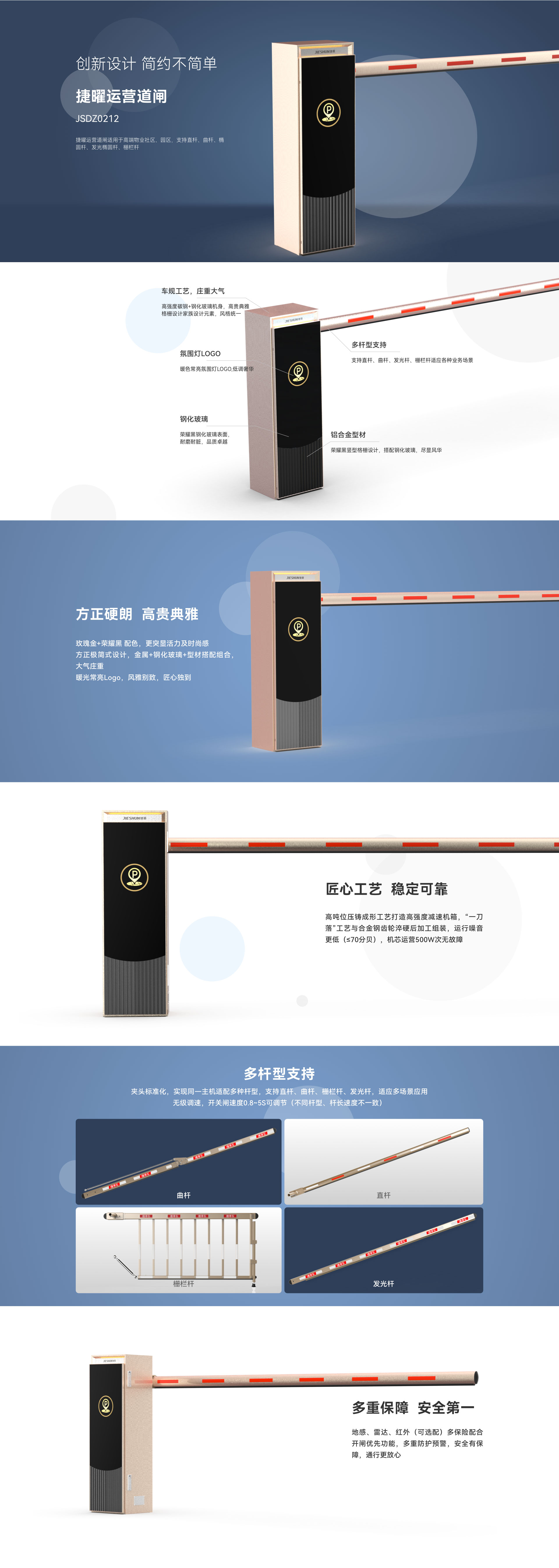 应用场景:捷曜运营道闸适用于高端物业社区、 园区,支持直杆、曲杆、椭圆杆、发光椭圆杆、栅栏杆。
