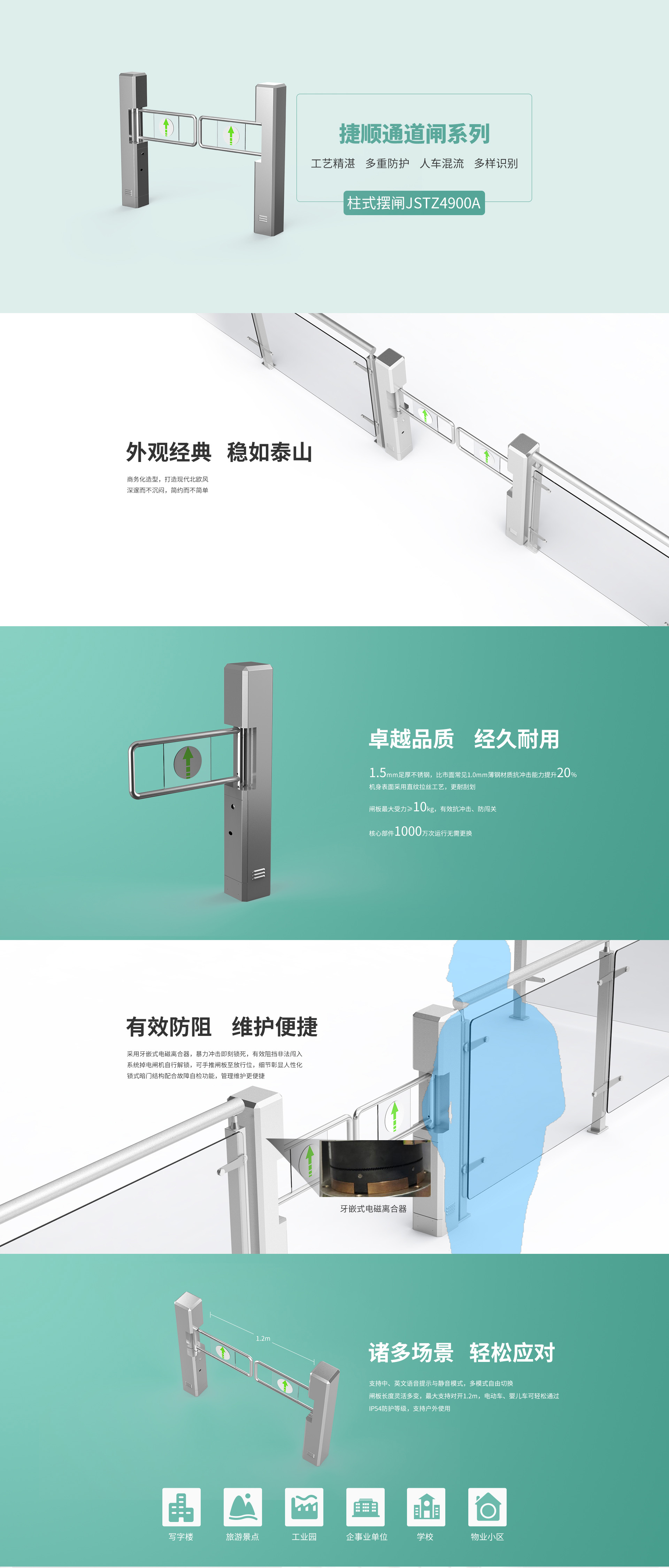 柱式摆闸JSTZ4900A安装便利,可根据现场环境选择通道长度及宽度。柱式摆闸应用领域十分广泛,涵盖交通领域、场馆、旅游景点、写字楼大厦、工厂、企事业、超市、学校、小区等。支持集成多种读卡设备,且红外检测由反射电眼+反射镜片更改为对射电眼,提升了设备使用环境。