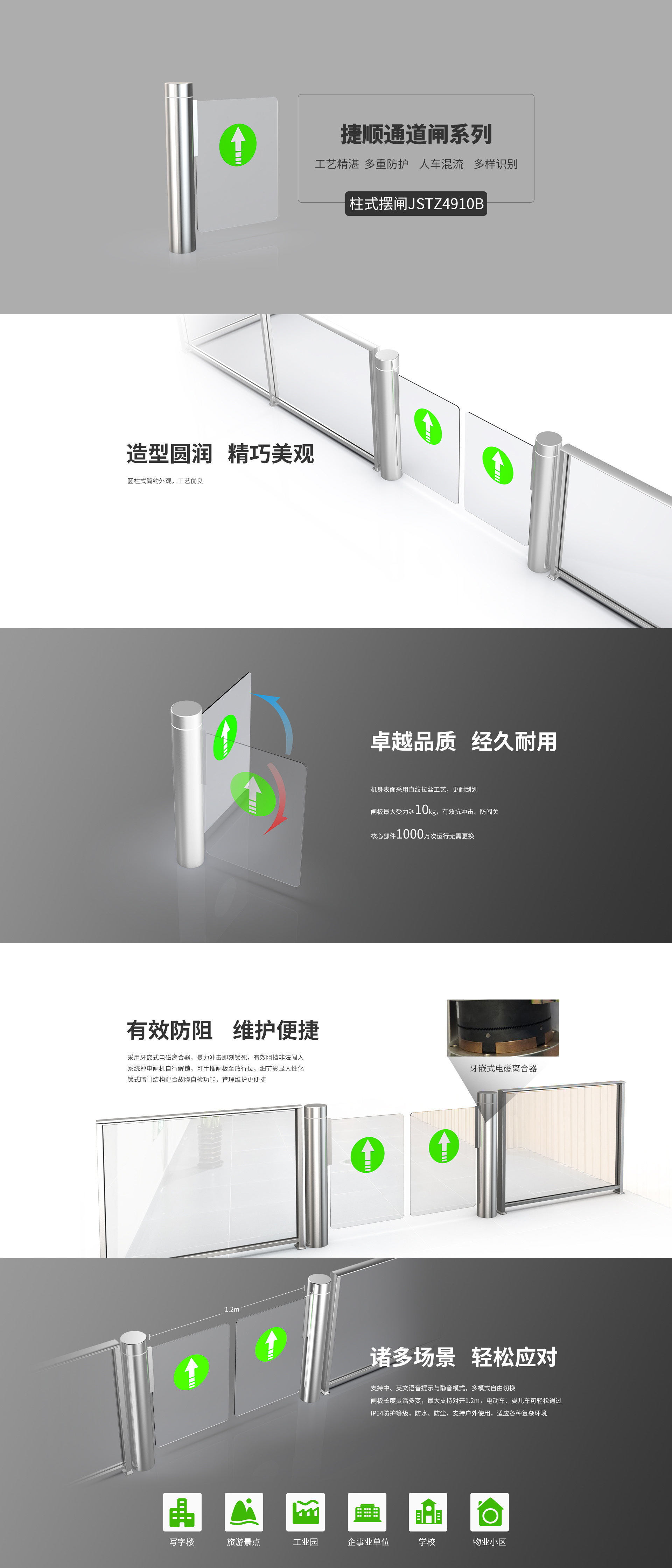 柱式摆闸JSTZ4910B安装便利,可根据现场环境选择通道长度及宽度。柱式摆闸应用领域十分广泛,涵盖交通领域、场馆、旅游景点、写字楼大厦、工厂、企事业、超市、学校、小区等。支持集成多种读卡设备,且红外检测由反射电眼+反射镜片更改为对射电眼,提升了设备使用环境。