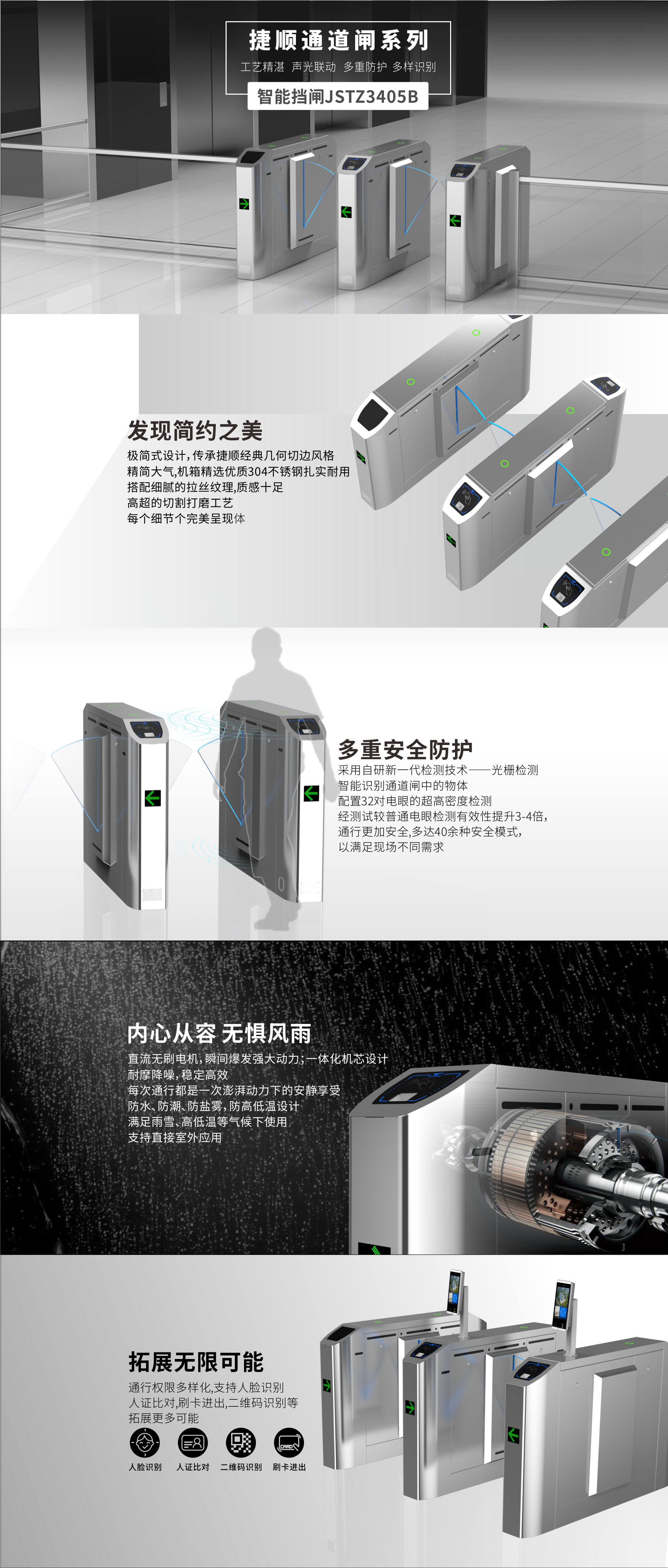 智能翼闸JSTZ3405B采用新的不锈钢材质(高档电梯板),拉丝更均匀细腻,表面质感更好。结构配置模块化,标准支持公司绝大多数门禁产品。检测间距30mm,行人检测精准度高,有效防夹、防撞,确保行人、闸机安全。广泛应用于需严格管控行人出入的场景,如景区、交通枢纽、大型场馆的出入口及政府机构的大厅等。